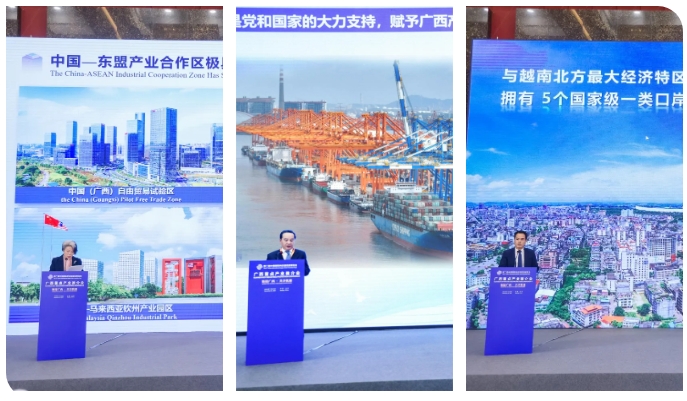 在专题推介环节,广西壮族自治区产业园区改革发展办公室、自治区工业和信息化厅、防城港国际医学开放试验区工作办公室负责人分别就广西重点产业园区、广西装备制造、汽车、食品等重点产业和防城港国际医学开放试验区作招商推介,宣传广西构建跨区域跨境产业链供应链的新举措、新成效、新商机。不少嘉宾表示,看好广西的发展潜力,期待加强合作,促进互利共赢。