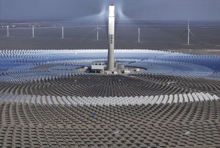 这是2024年9月12日在新疆哈密市伊吾县淖毛湖镇拍摄的国家光热示范项目——熔盐塔式50兆瓦光热发电站(无人机照片)。新华社记者 胡虎虎 摄