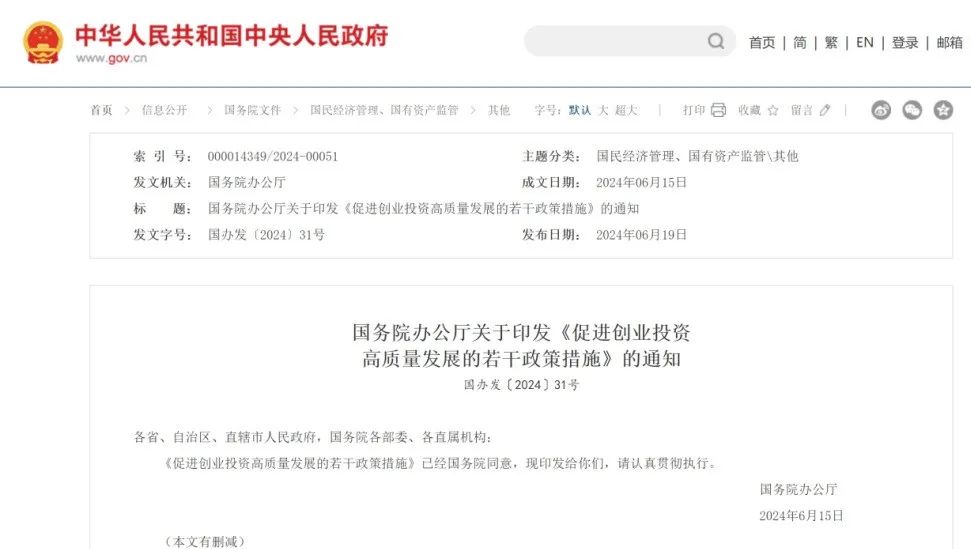 6月19日,国务院办公厅印发《促进创业投资高质量发展的若干政策措施》,措施共六项、十七条细则,涵盖募、投、管、退等全链条,支持创业投资高质量发展。