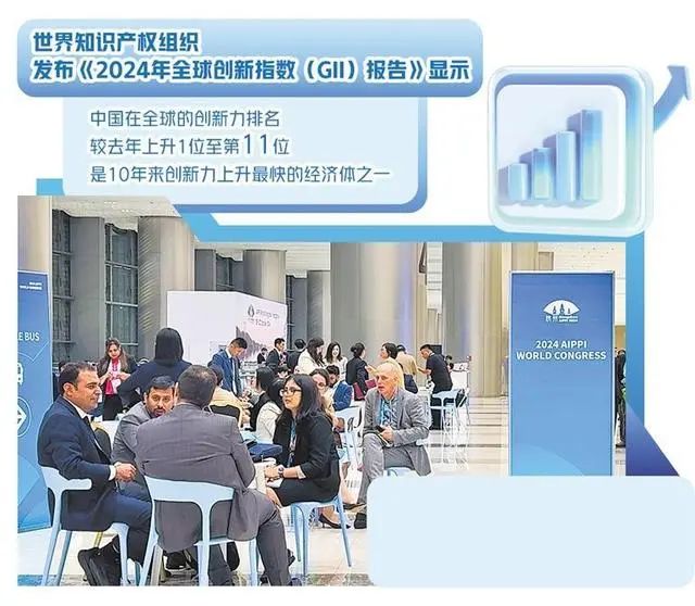 这次大会是国际保护知识产权协会成立127年来首次在中国举办,不仅体现了国际社会对中国知识产权事业历史性成就的高度认可,也凸显了中国在世界创新版图中的重要地位。今年9月26日,世界知识产权组织发布的《2024年全球创新指数(GII)报告》显示,中国在全球的创新力排名较去年上升一位至第11位,是10年来创新力上升最快的经济体之一;中国是全球创新指数排名前30的经济体中唯一的中等收入经济体;中国拥有26个全球百强科技创新集群,连续第二年位居世界第一位。自2007年《全球创新指数报告》首次发布以来,中国各项排名不断提升,今年又有新的进展。中国在全球创新指数上的排名不断上升,折射出新时代以来中国创新发展的不凡成绩,也充分证明中国特色知识产权发展之路走对了。