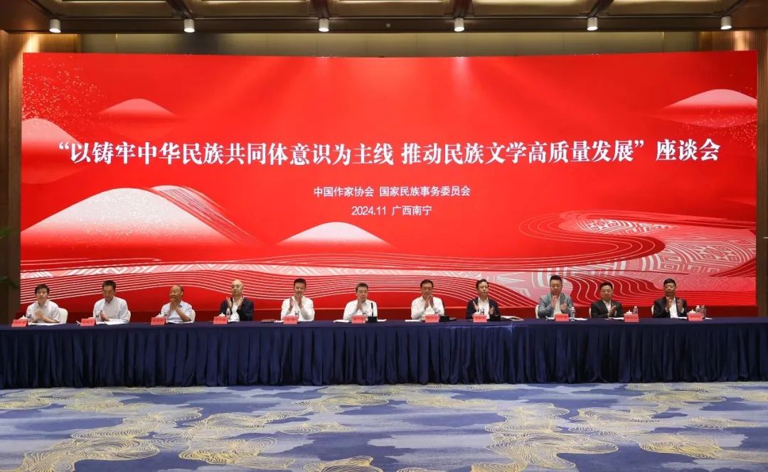 11月17日,由中国作家协会与国家民族事务委员会主办的“以铸牢中华民族共同体意识为主线 推动民族文学高质量发展”座谈会在广西南宁举行。中央统战部副部长,国家民委主任、党组书记潘岳,中国作协党组书记、副主席、书记处书记张宏森出席并讲话。中国作协党组成员、副主席、书记处书记李敬泽主持座谈会。广西壮族自治区人民政府副主席胡帆,中国作协党组成员、副主席、书记处书记吴义勤、邱华栋,中国作协副主席白庚胜、阿来,中国作协党组成员、书记处书记胡邦胜、施战军、李一鸣出席会议。