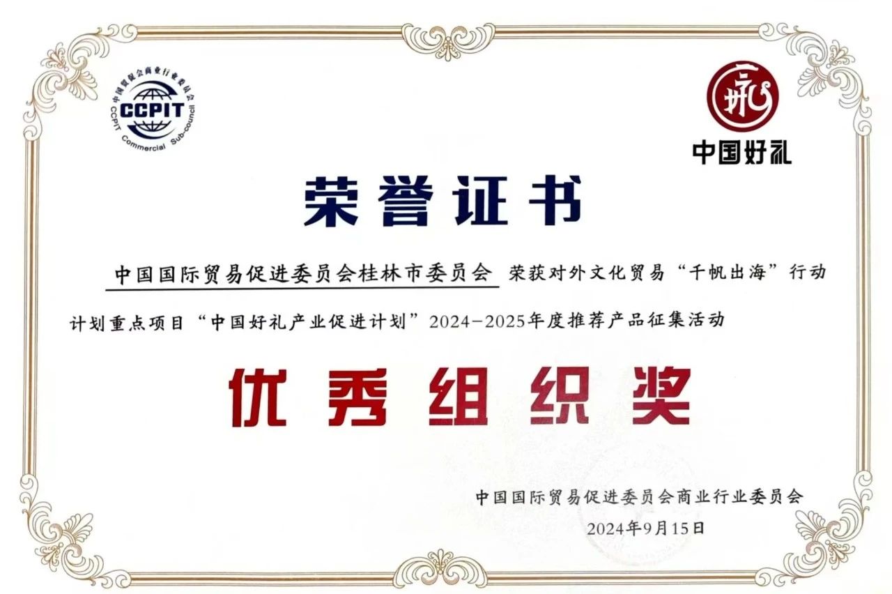 桂林市贸促会认真筹划、精心组织、广泛宣传中国好礼年度推荐产品征集活动,走访企业挖掘亮点,成立桂林国际商会传承和促进非物质文化遗产委员会,充分发动桂林广大非遗文化企业参与申报,共有7种产品成功入选《中国好礼产业促进计划2024-2025年度推荐产品名录》,成功扩大桂林乃至广西文化的国际影响力。