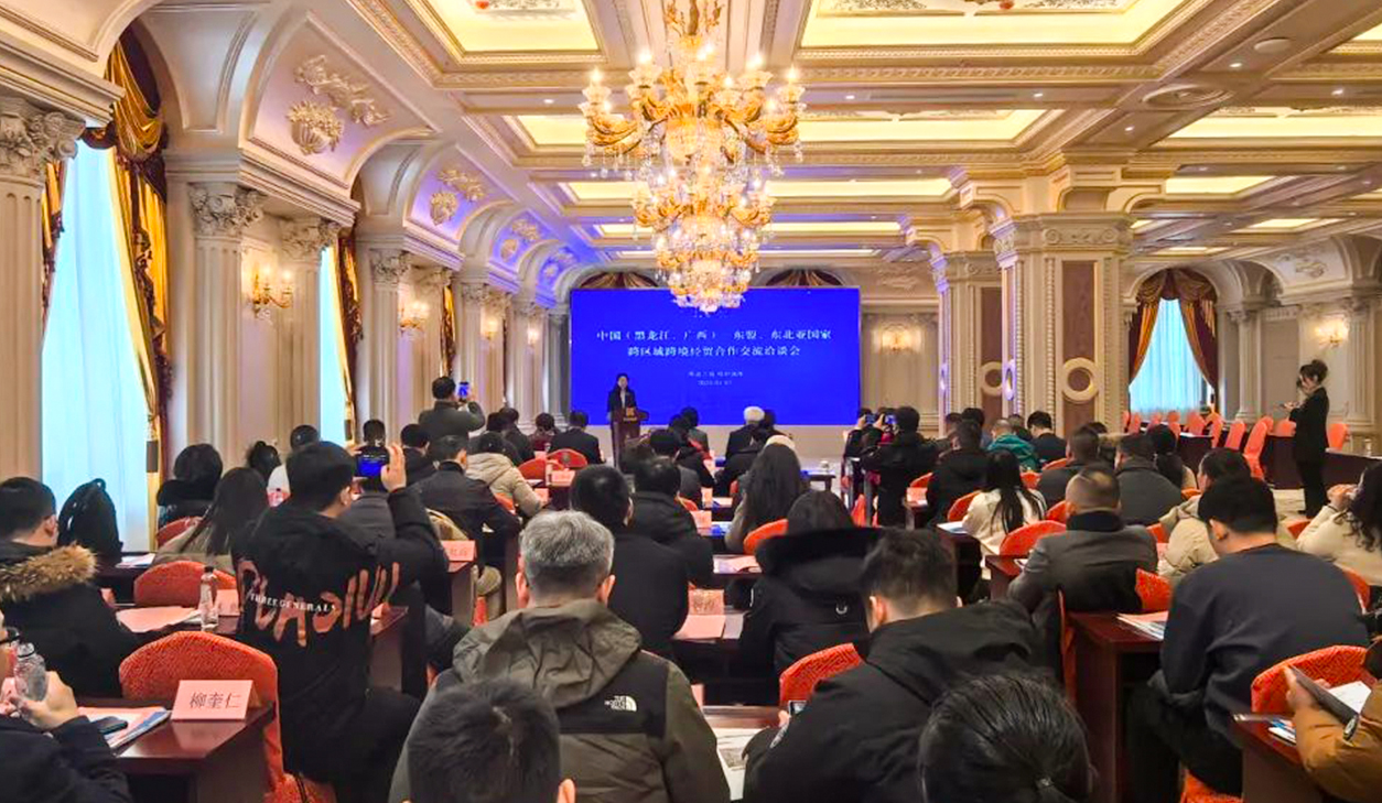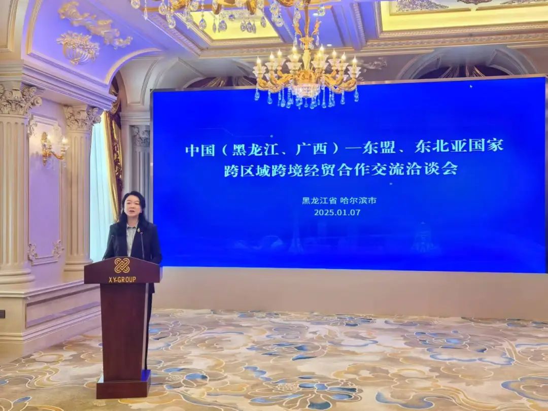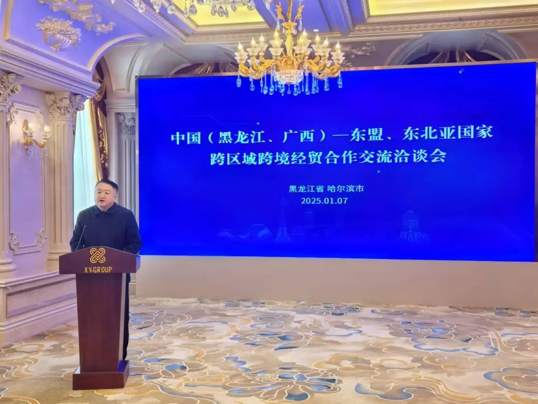 2025年1月7日,中国(黑龙江、广西)—东盟、东北亚国家跨区域跨境经贸合作交流洽谈会在黑龙江省哈尔滨市成功举行。广西贸促会会长杨雁雁、黑龙江省贸促会会长陈士军出席并致辞,两省区贸促系统、商协会和企业代表等近百人参会。该活动是中国—东盟商务理事会联席秘书处2025年举办的首个经贸活动,也是务实服务全国更多省区与东盟开展合作的具体举措之一,旨在与黑龙江省贸促会发挥各自优势,有效链接和推动广西、黑龙江与东盟、东北亚国家的跨区域跨境产供链合作。