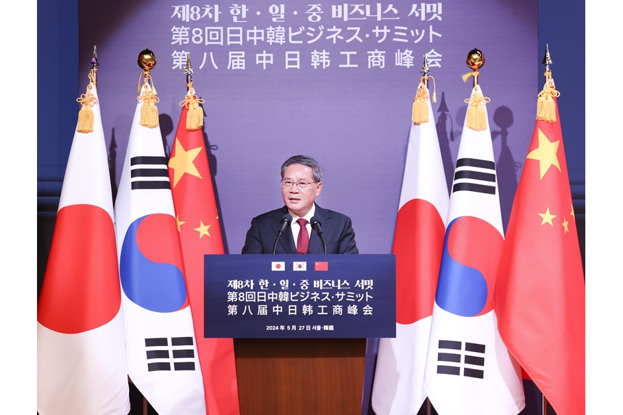 2024年5月27日,第八届中日韩工商峰会在首尔举办,国务院总理李强与韩国、日本领导人共同出席峰会并致辞。