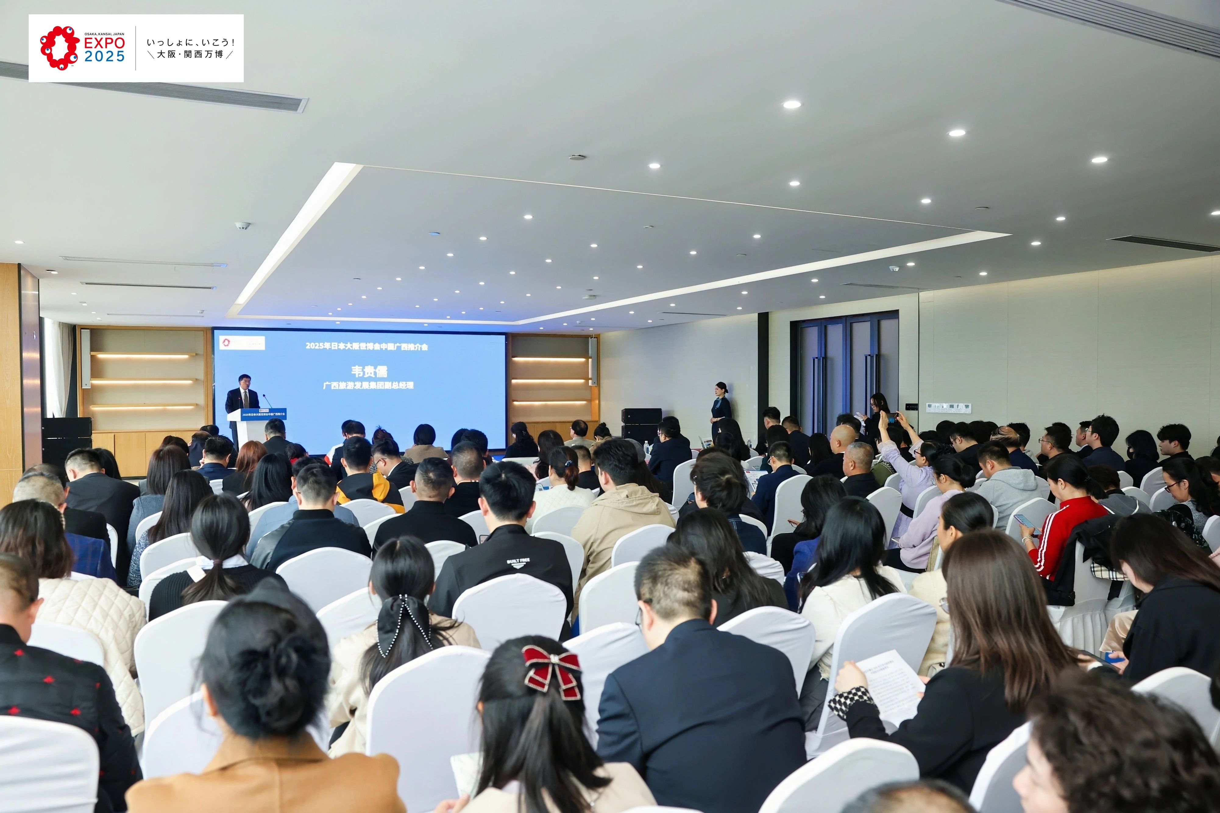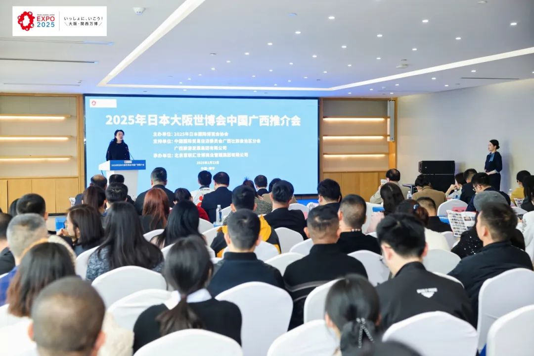 广西贸促会党组书记、会长杨雁雁,广西旅游发展集团有限公司副总经理韦贵儒出席推介会并致辞。2025年日本国际博览会协会宣传推广局局长小林浩史发表视频致辞,协会代表松田博和进行大阪世博会现场推介。会上,北京意联汇世博商业管理集团有限公司总经理冯玉婷就世博会票务及世博期间有关展会安排进行介绍。大阪世博会中国馆广西活动周工作专班各成员单位、全区贸促系统、商协会和企业负责人逾160人参会。