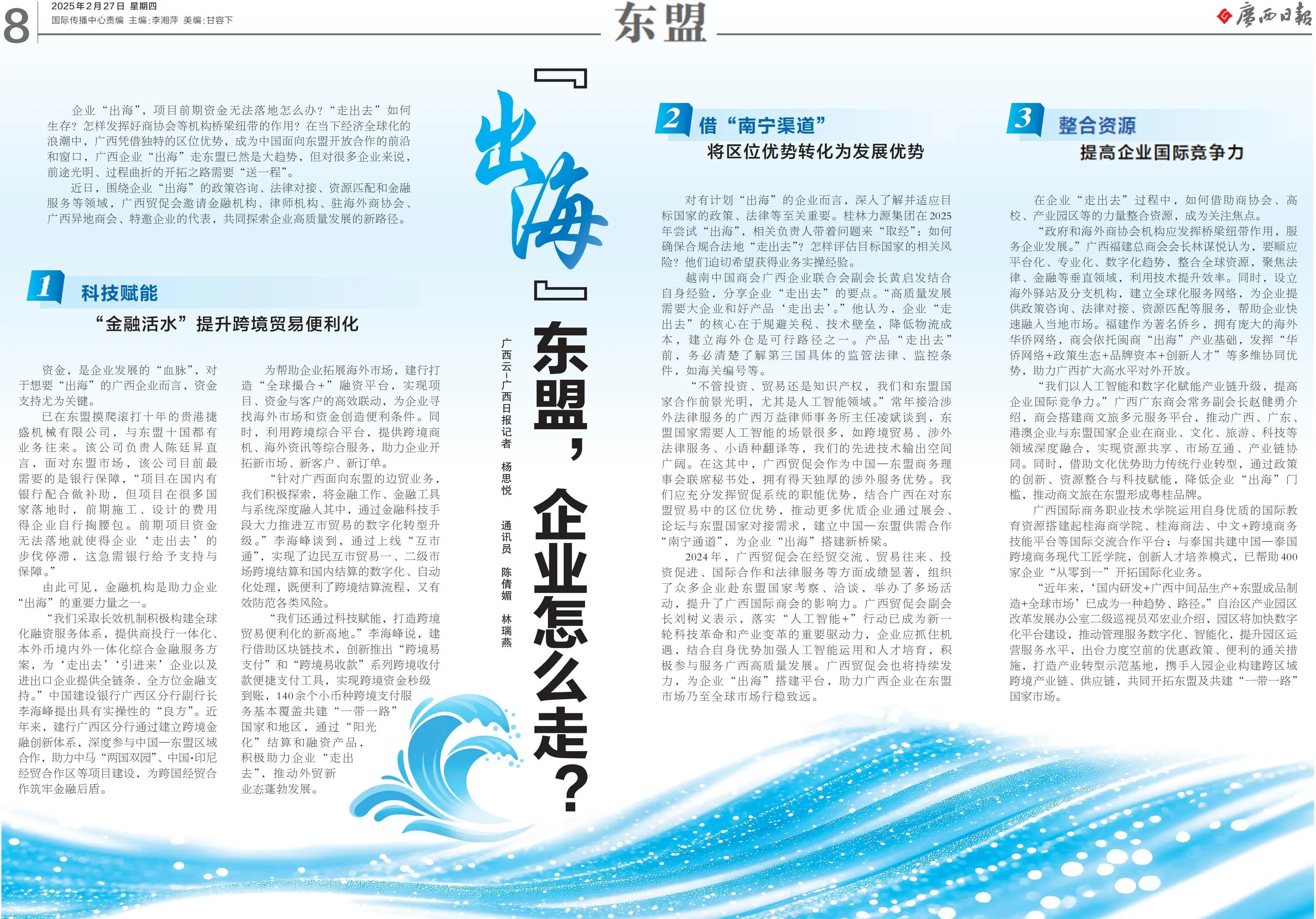 在当下经济全球化的浪潮中,广西凭借独特的区位优势,成为中国面向东盟开放合作的前沿和窗口,广西企业“出海”走东盟已然是大趋势,但对很多企业来说,前途光明、过程曲折的开拓之路需要“送一程”。