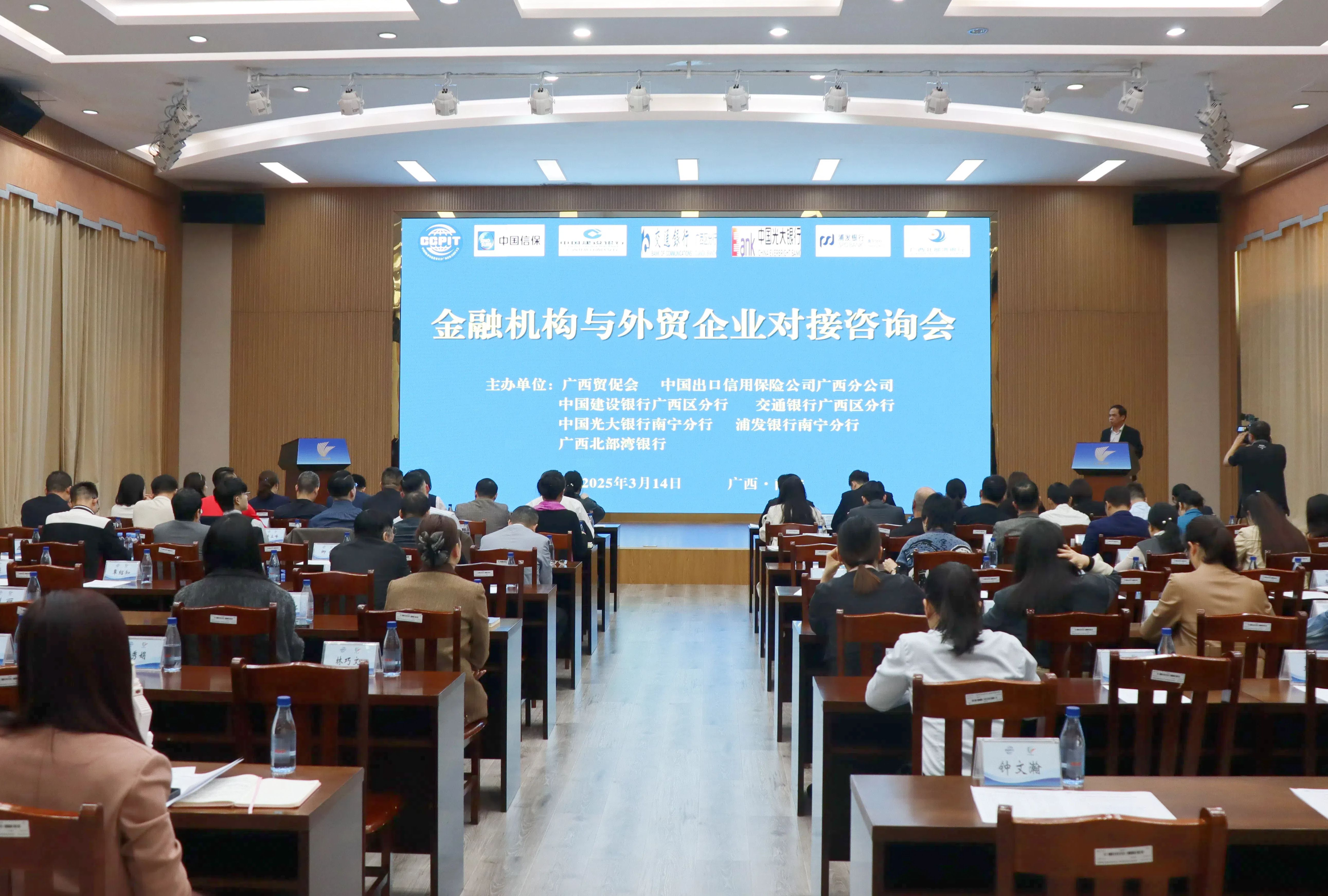 2025年3月14日,广西贸促会与中国出口信用保险公司广西分公司、中国建设银行广西区分行、交通银行广西区分行、中国光大银行南宁分行、浦发银行南宁分行、广西北部湾银行6家金融机构在南宁共同举办了金融机构与外贸企业对接咨询会,来自广西各地的60多家外贸企业约100名代表参加会议。