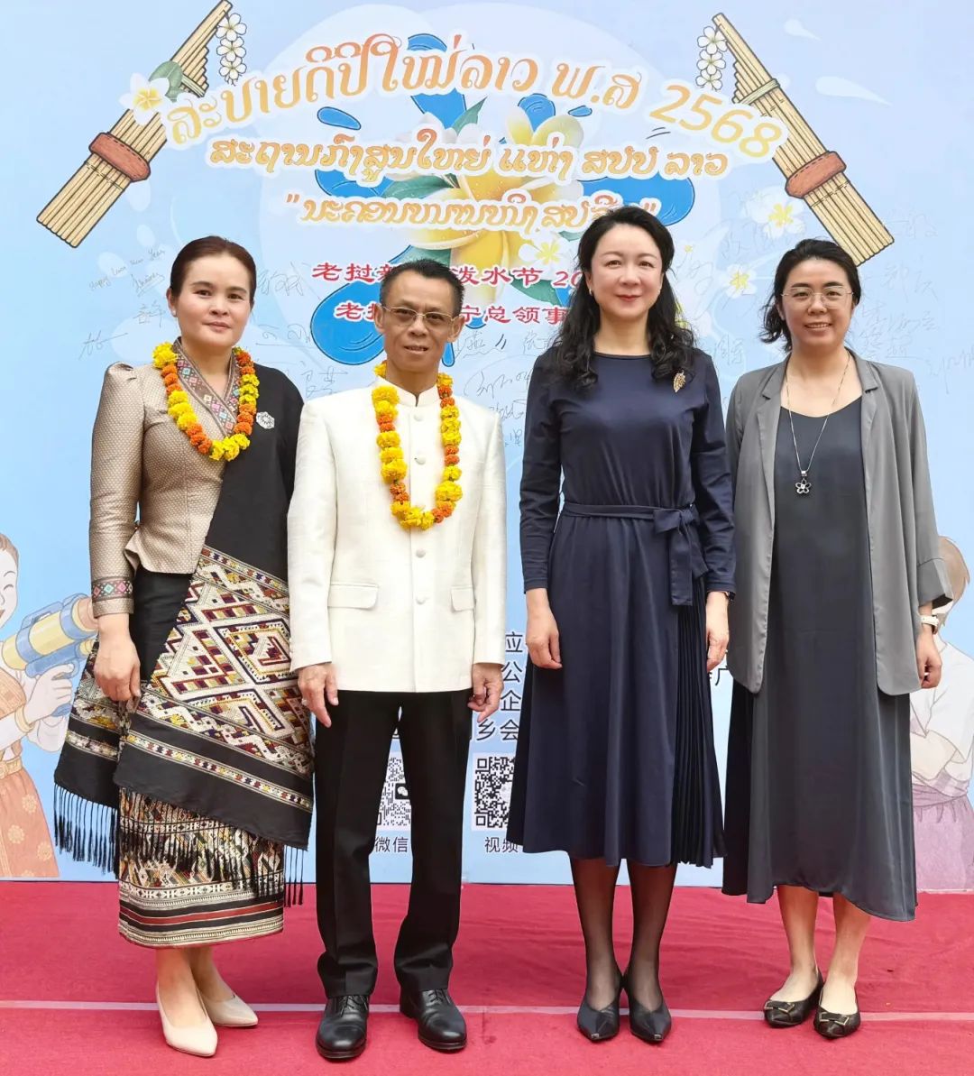 2025年4月12日,广西贸促会会长杨雁雁应邀出席老挝驻南宁总领事馆举办的“老挝新年庆典活动”。老挝驻南宁总领事翁巴努·西巴色发表致辞,泰国驻南宁总领事彬嘉玛·塔维她雅浓、柬埔寨驻南宁总领事唐肃安、马来西亚驻南宁总领事法蒂尔·伊斯迈尔、缅甸驻南宁总领事凯素林、香港驻广西联络处主任王卓然、广西外事办和广西博览局等单位代表500余人共聚一堂,共庆老挝佛历2568年新年,深化中老两国文化交流。