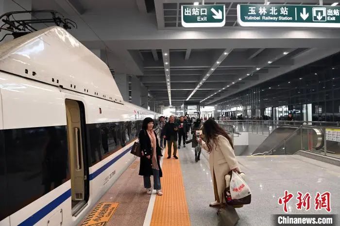 12月30日,南珠高铁南玉段开通运营。乘坐玉林至南宁首发动车的旅客在上车前拍照留念。中新社记者 蒋雪林 摄