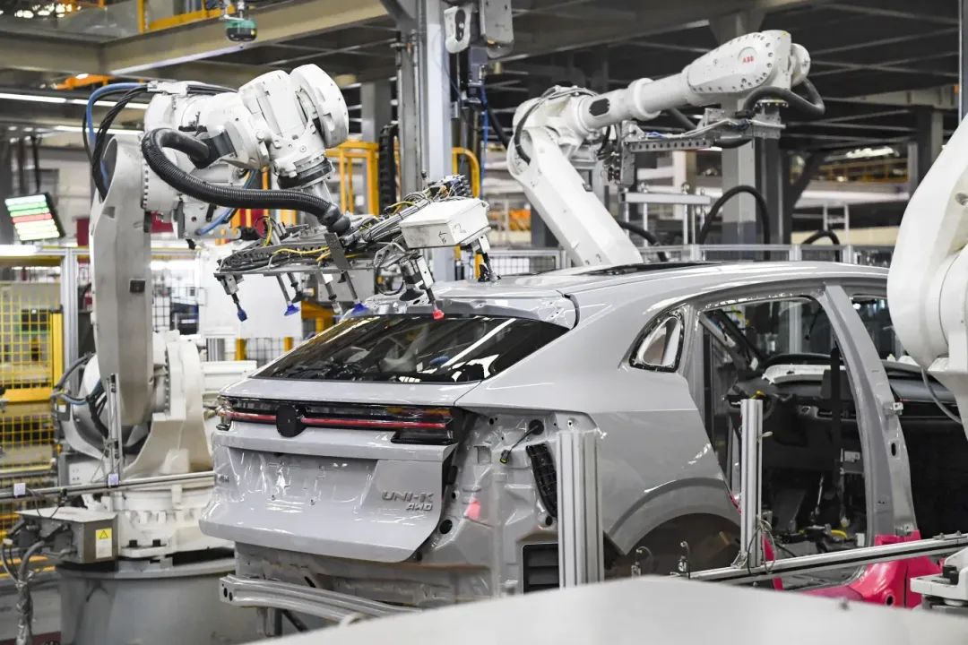 工业机器人有序生产,载有汽车车身的无人驾驶物流车在各车间穿行,250多台机器人负责汽车的组装、检测、运输……从高处俯瞰,这样的生产模块的确像一个个“岛屿”,排列错落有致,一辆辆新能源智能化汽车在这里下线,被送往全国乃至国际市场。