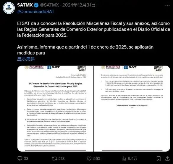 墨西哥2024年12月31日宣布新的关税政策 推文截图