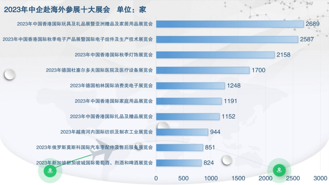 二是海外参展中企的行业仍集中于制造业领域。从2024年赴外参展企业行业分布来看,排名前10的依次是建材(6073家)、电子(4666家)、机械(4427家)、工艺品礼品(2692家)、五金(2626家)、汽车配件及售后(2321家)、化工(2232家)、工程机械及配件(2051家)、照明(1886家)、电工(1832家)。在细分行业中,排名前10的依次是其他电子(2863家)、塑料(1223家)、玩具礼品(1158家)、其他照明(1023家)、其他五金(845家)、建筑玻璃(840家)、其他汽车配件(816家)、其他工艺品礼品(784家)、家用电器(783家)、医疗设备(738家)。由此可见,制造型企业仍是中企海外参展的主力军。一方面,这些行业本身就是中国的传统优势行业,行业基础好;另一方面,制造业产品具有广泛的市场需求和应用场景,通过参展,企业能够更好地了解国际市场的趋势和需求,展示自身产品质量和技术实力,拓展销售渠道,提升在全球产业链中的地位,推动制造业的国际化发展。