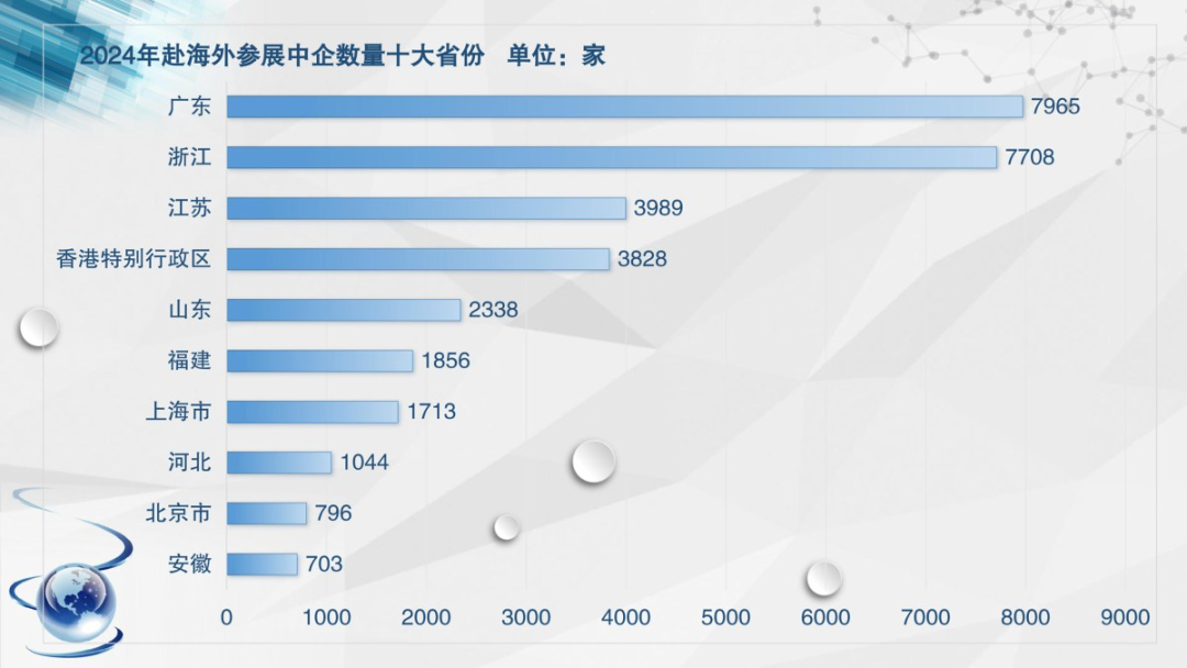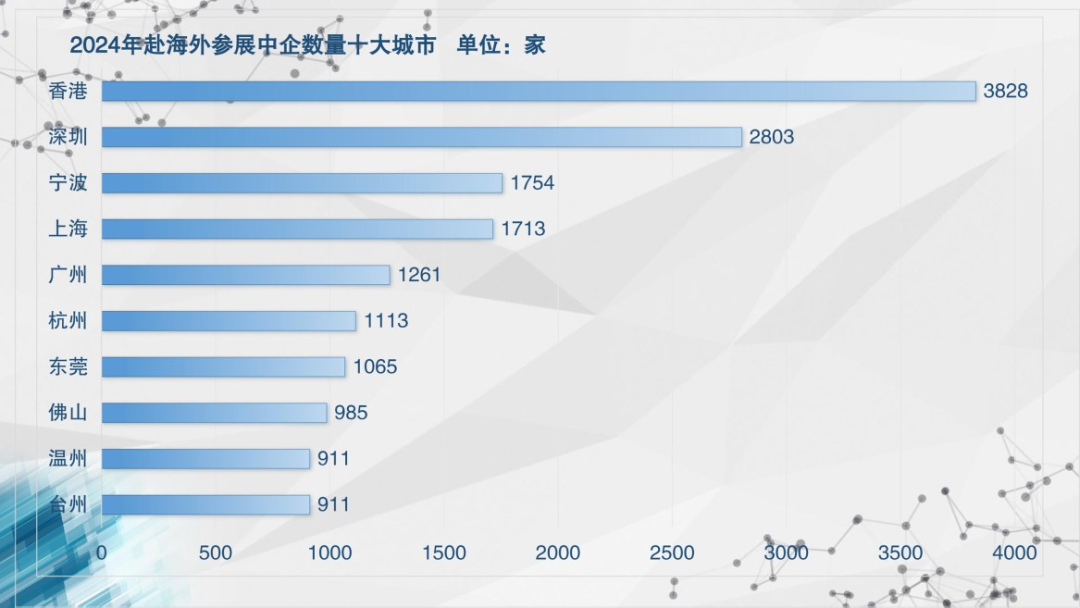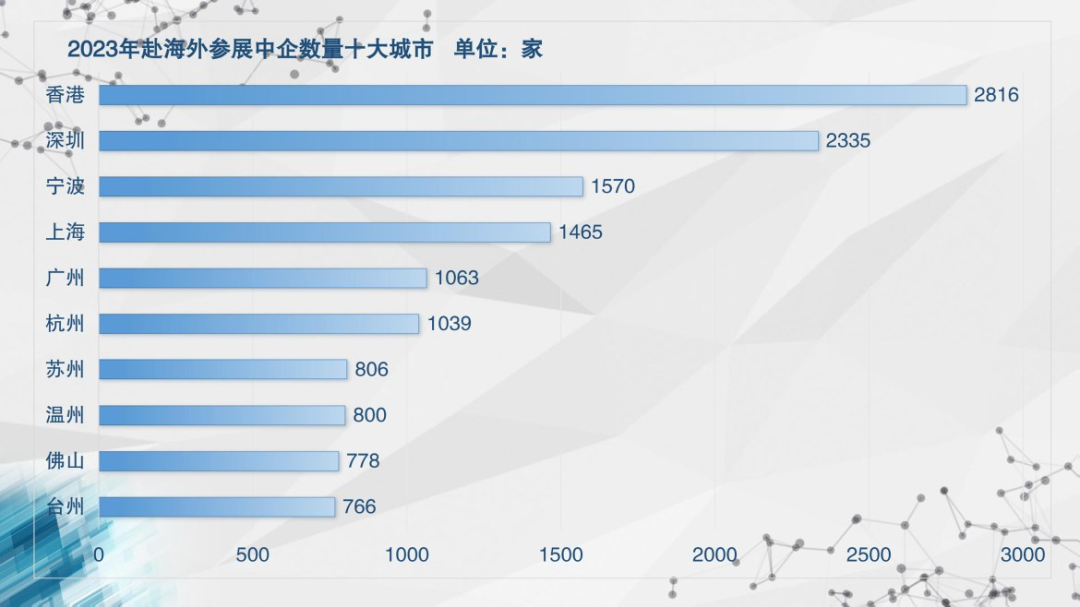 一是来自外贸发达地区的中企依旧是海外参展的主力。从赴外参展中企来自的省份来看,排在前10的依次是广东省(参展企业7965家,下同)、浙江省(7708家)、江苏省(3989家)、香港特别行政区(3828家)、山东省(2338家)、福建省(1856家)、上海市(1713家)、河北省(1044家)、北京市(796家)、安徽省(703家)。从参展商来自的城市来看,展商数量前10的依次是香港特别行政区(3828家)、深圳市(2803家)、宁波市(1754家)、上海市(1713家)、广州市(1261家)、杭州市(1113家)、东莞市(1065家)、佛山市(985家)、台州市(911家)、温州市(911家),均为东南沿海的港口城市。省份中,广东省和浙江省遥遥领先,远超其他省份,反映出两地经济发展水平较高,外向型经济明显,产业结构较完善,拥有较多具有竞争力的外贸企业。与此同时,当地政府对企业的国际化发展支持力度大,企业自身也具备较强的参展意识和资金实力,能够积极组织和参与海外展会,借助展会平台拓展国际市场,提升区域产业的国际影响力。