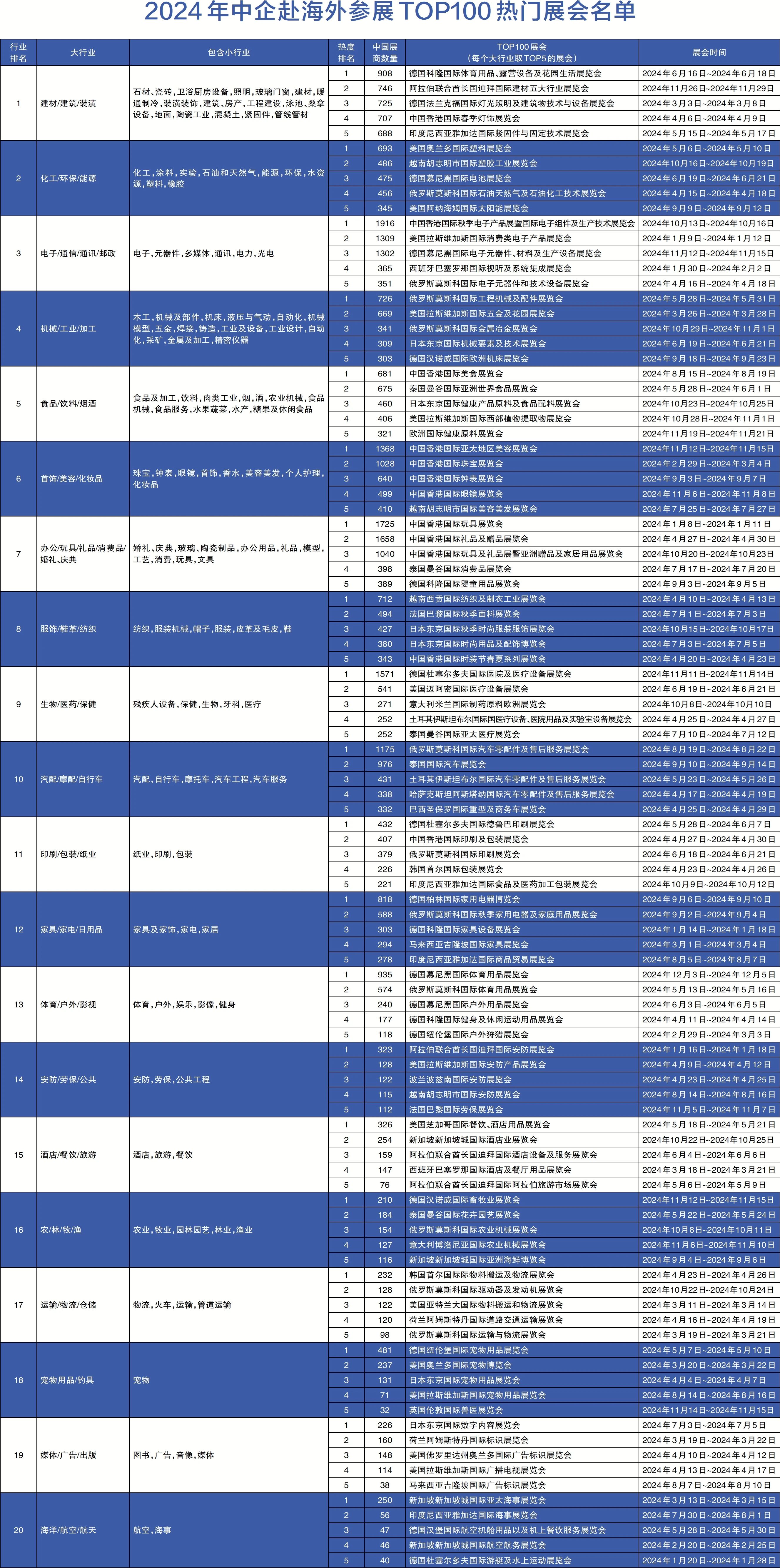 2024年,我国企业积极赴海外参展,为巩固外贸基本盘发挥了重要作用。本报中贸智库会展项目组对2024年度中企海外参展情况作了抽样分析,推出中企海外参展热门展会100强榜单。本次调研集中在海关分类的20个大行业,涉及海外展会数量超过1900个,中国展商超过10万家。百强榜单所列出的是这20个大行业里中国展商数量前五的专业展会,构成年度中企海外参展热门展会100强,涉及中国展商数量4万余家,彰显2024年中企赴外参展的良好势头。从该榜单排名来看,2024年中企赴外参展呈现出以下特征。
