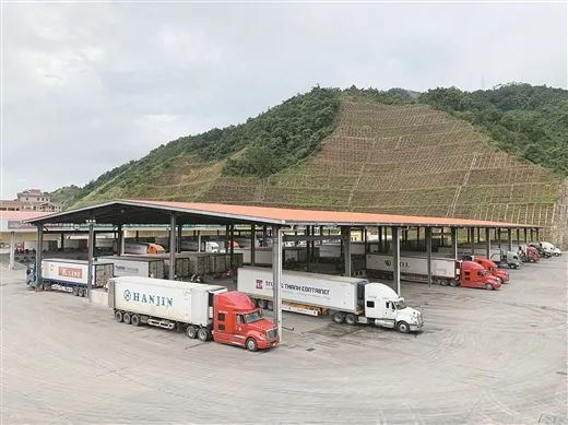 一辆辆满载东南亚水果的卡车从友谊关口岸入境,在中国—东盟(崇左)水果交易中心进行换车。广西云-广西日报记者管林华/摄