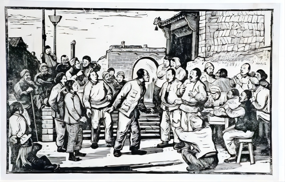 《解放日报》1944年10月9日刊登的古元木刻画《马锡五同志调解诉讼》。资料图片