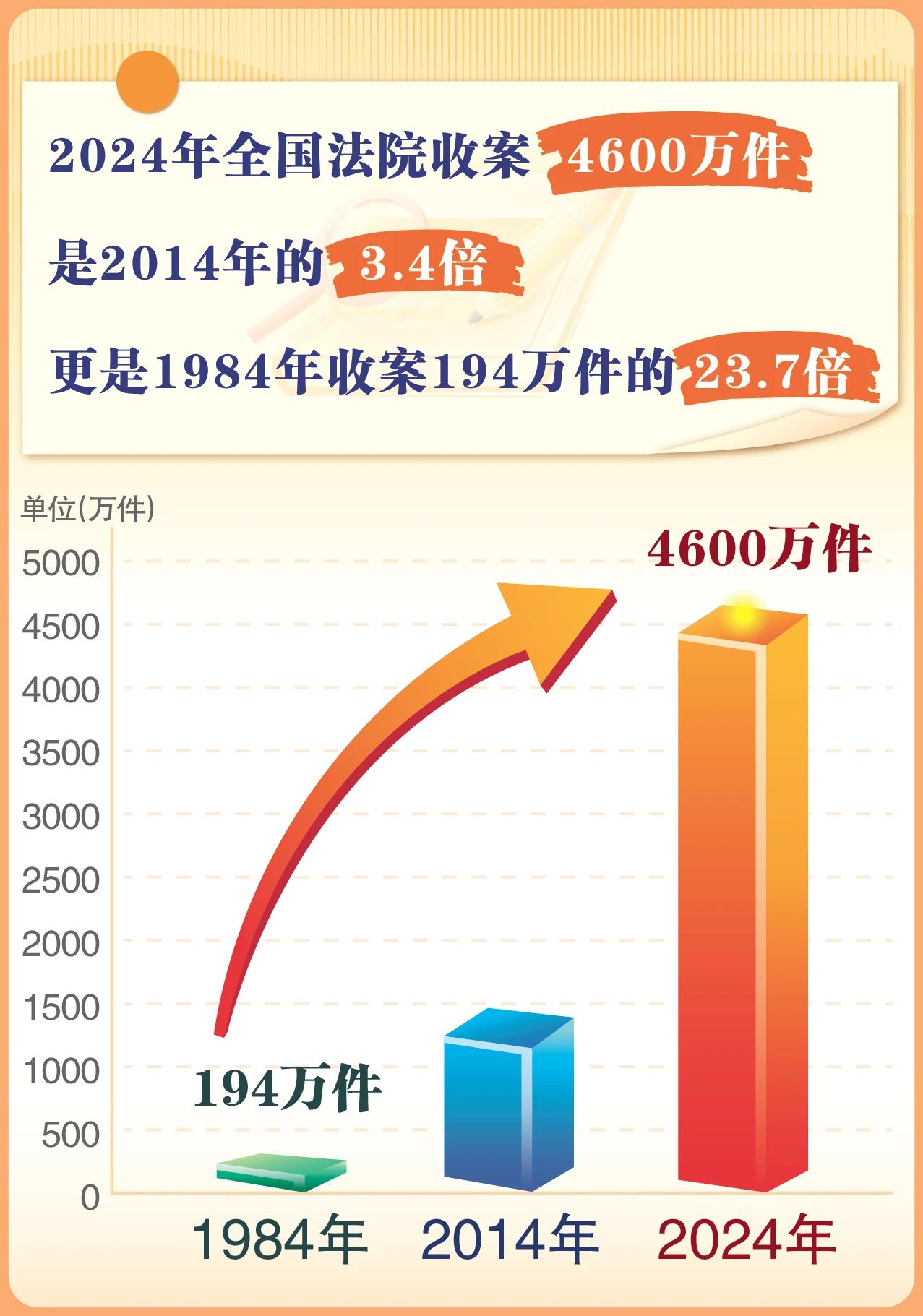 随着经济社会持续快速发展和人民群众权利意识增强,各种利益纠纷以诉讼的形式涌入人民法院。2024年全国法院收案4600余万件,是2014年的3.4倍,更是1984年收案194万件的23.7倍。