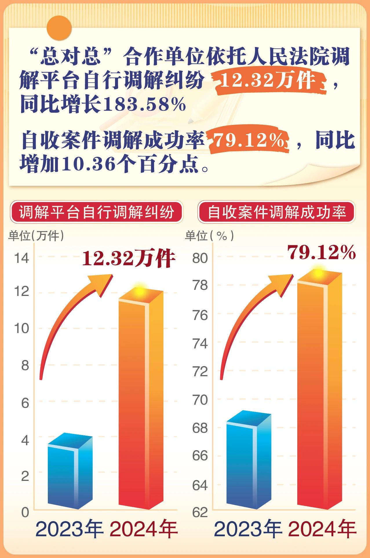 2024年,全国法院指导各类调解组织先行调解案件1218.2万件,同比增长1.5%,约四成通过调解方式在前端实质化解。“总对总”合作单位依托人民法院调解平台自行调解纠纷12.32万件,同比增长183.58%,自收案件调解成功率79.12%,同比增加10.36个百分点。
