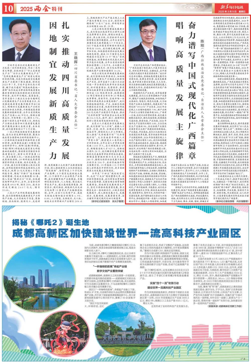 因地制宜发展新质生产力,增强高质量发展动能。广西科教资源相对不足,培育发展新质生产力,必须选准方向、突出重点,力争在新领域新赛道迎头赶上。我们深化教育科技人才综合改革,加强科教创新和产业创新融合,主动融入粤港澳大湾区的产业链、创新链、供应链、资金链,加快建设面向东盟的科技创新合作区和产教集聚示范区,高新技术产业化水平指数连续6年进入全国前十,国家重点实验室总量首次进入全国第二梯队。人工智能时代,广西不能缺席、不能落后。我们充分发挥背靠国内大市场、联结东南亚的优势,坚持有所为、有所不为,利用好中国—东盟信息港、南宁国际通信业务出入口局等平台,推动建设中国—东盟人工智能创新合作中心,筹建人工智能学院,加快建设南宁五象云谷AI智算产业园,打造42个人工智能平台和场景,在多个东盟国家落地数据中心、算力中心,以人工智能为引领的新质生产力加快培育。今年2月,广西代表团访问老挝期间,双方签约共建中国—老挝人工智能创新合作中心,这是我国与东盟国家签订的首个人工智能合作创新平台。