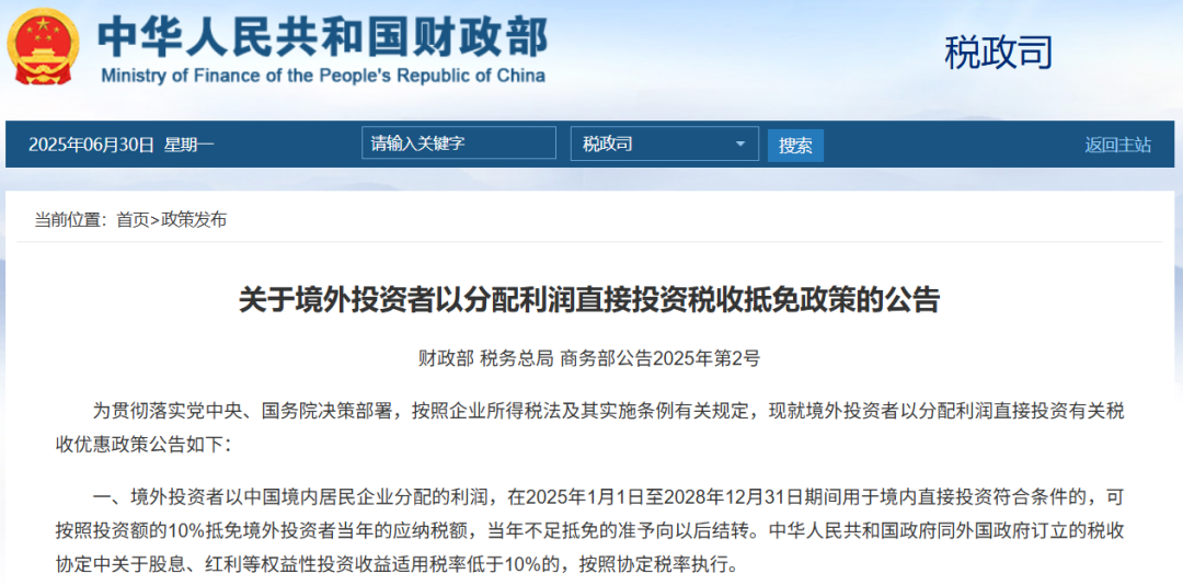 二号公告!境外投资者利润再投资可抵税,最高10%!